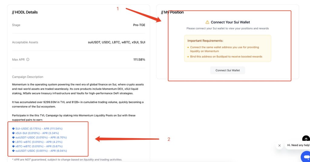 Momentum的空投活动主要通过Buidlpad上发布,目前项目处于预备空投的阶段。这些活动旨在奖励早期用户和流动性提供者,为未来的代币分发做准备。