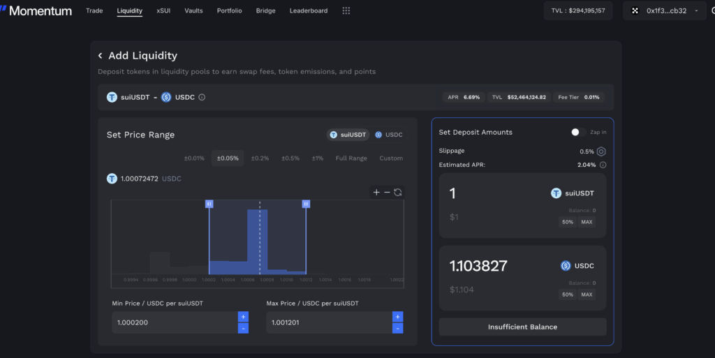 小编选择的是suiUSDT – USDC的池子,因为是两个稳定币的交易对,不会存在无常损失,如果你选择了sui-USDC的交易对来组池子,如果sui代币在这段时间内有了很大的价格波动,会有无常损失的出现。即使年化利率非常的高,可能也会有一定的损失。