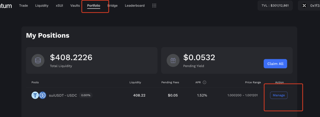 如果大家想要提前撤掉池子,拿出自己的资金,可以选择Portfolio,找到自己的池子并选择mange按钮
