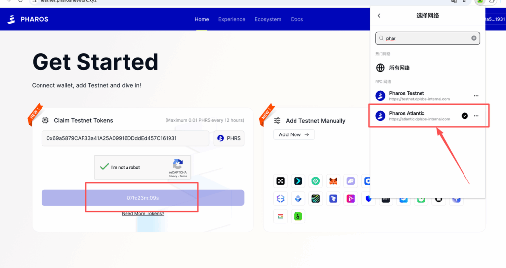 链接钱包后先去网页的下方进行领取测试网的代币。大概是每12小时可以领取 0.01个代币。(需要注意的是,新用户现在可能要绑定推特账号)