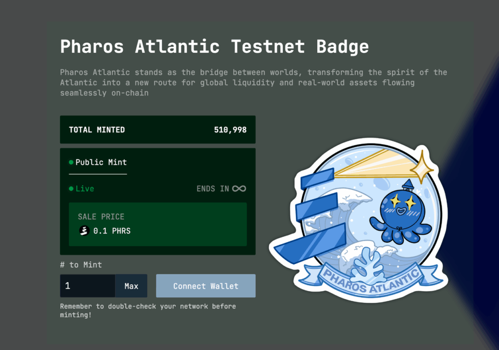 点击进入页面后 需要用到0.1个PHRS 来mint NFT 所有大家可以先保留自己手上的测试代币,优先去做这个任务