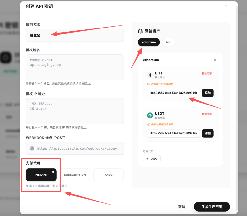 - 右侧选择你收款的网络资产,我们这里选择的是eth链的eth 和usdt
