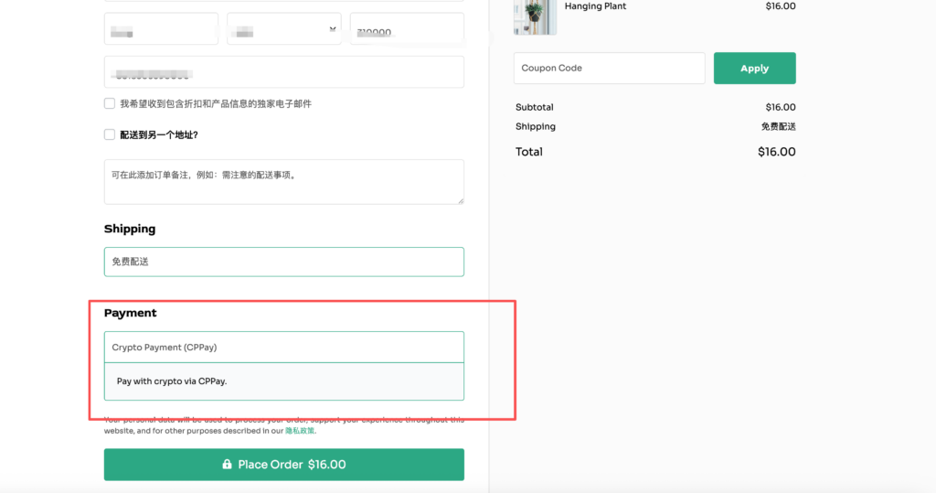 这里我们可以看到结算页面的payment 这里已经现实支持了CPPAY的支付。这个时候大家点进去就可以进行加密货币支付了