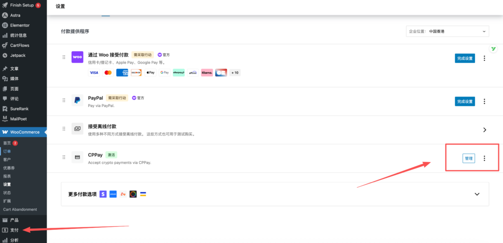 - 点击右侧的支付按钮,会自动跳转到woo commerce 的支付管理页面 ,这里我们能看到CPPAY的管理渠道已经生成了,但是我们这里还需要进一步设置,即配置api。