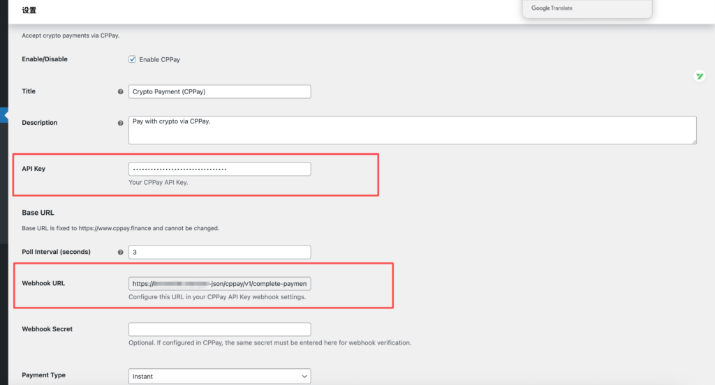 到这一步,加密货币支付的配置马上接近尾声了。我们这一步需要配置两个东西一个是apikey 一个是webhookurl