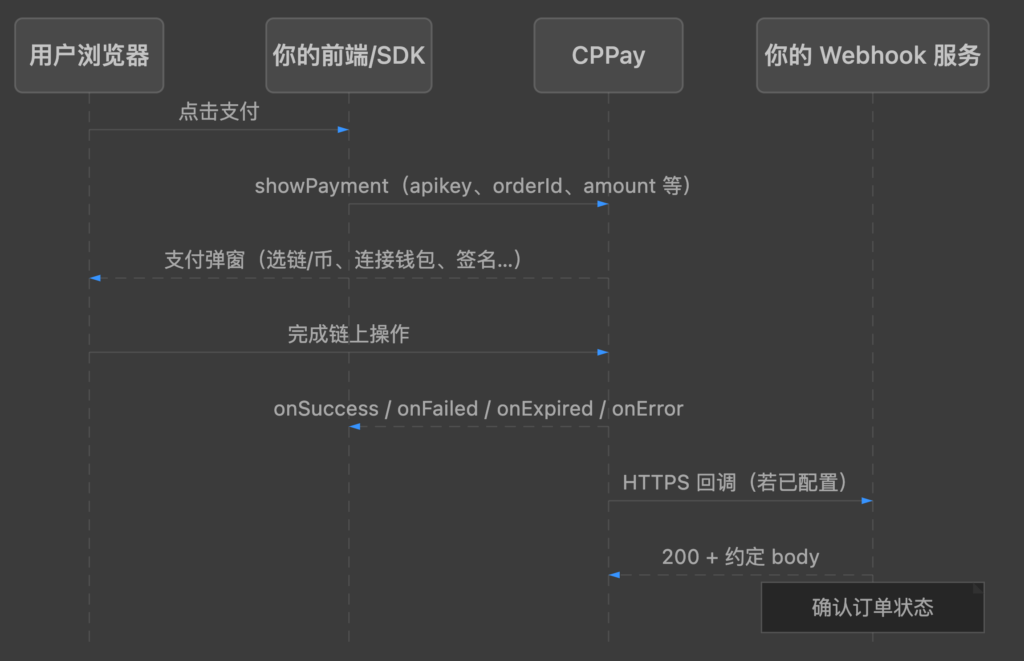 用户侧与系统侧大致经历:选链 / 选币 → 钱包签名与链上确认 → 平台确认 → 可选 Webhook 通知你的服务端。下面用一张简图串起来(便于和联调同事对齐术语)。