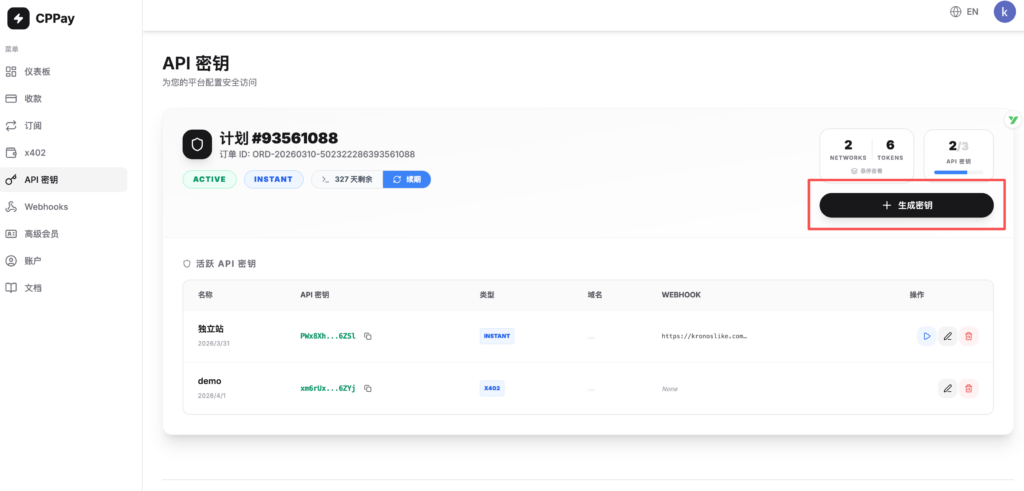注意:在生产密钥时,根据你产品的支付需求,选择需要的支付方式cppay提供了三种支付方式:单次支付、订阅支付、以及X402支付。这里我们选用默认的单词支付Instant