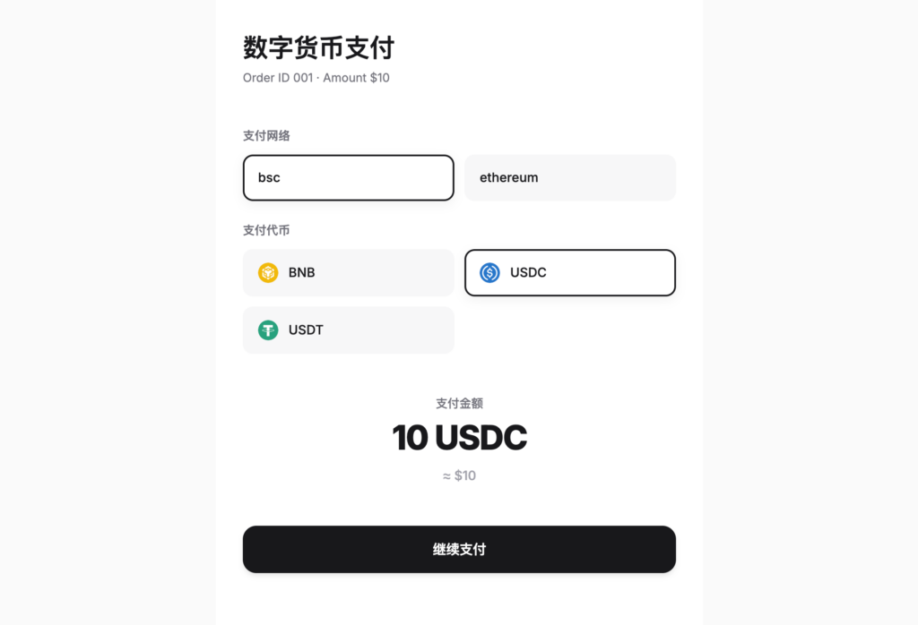 | 零 Web3 代码 | SDK 封装钱包连接、链切换、签名与广播;业务侧无需编写 Web3 逻辑,用户按弹窗步骤即可完成支付 |